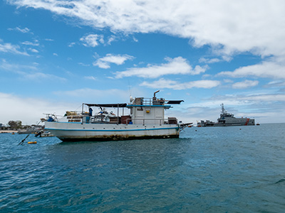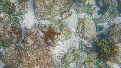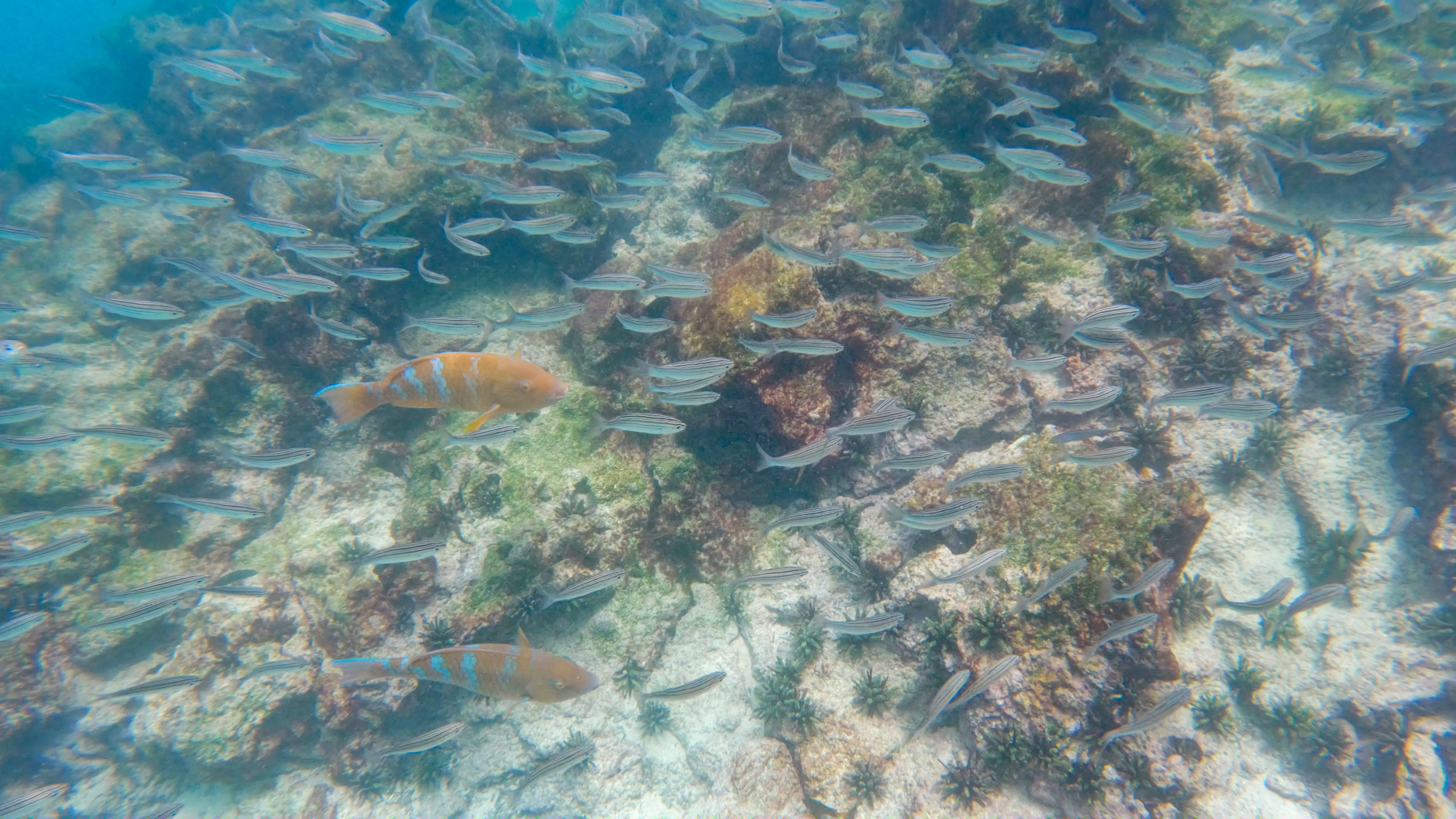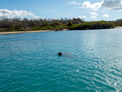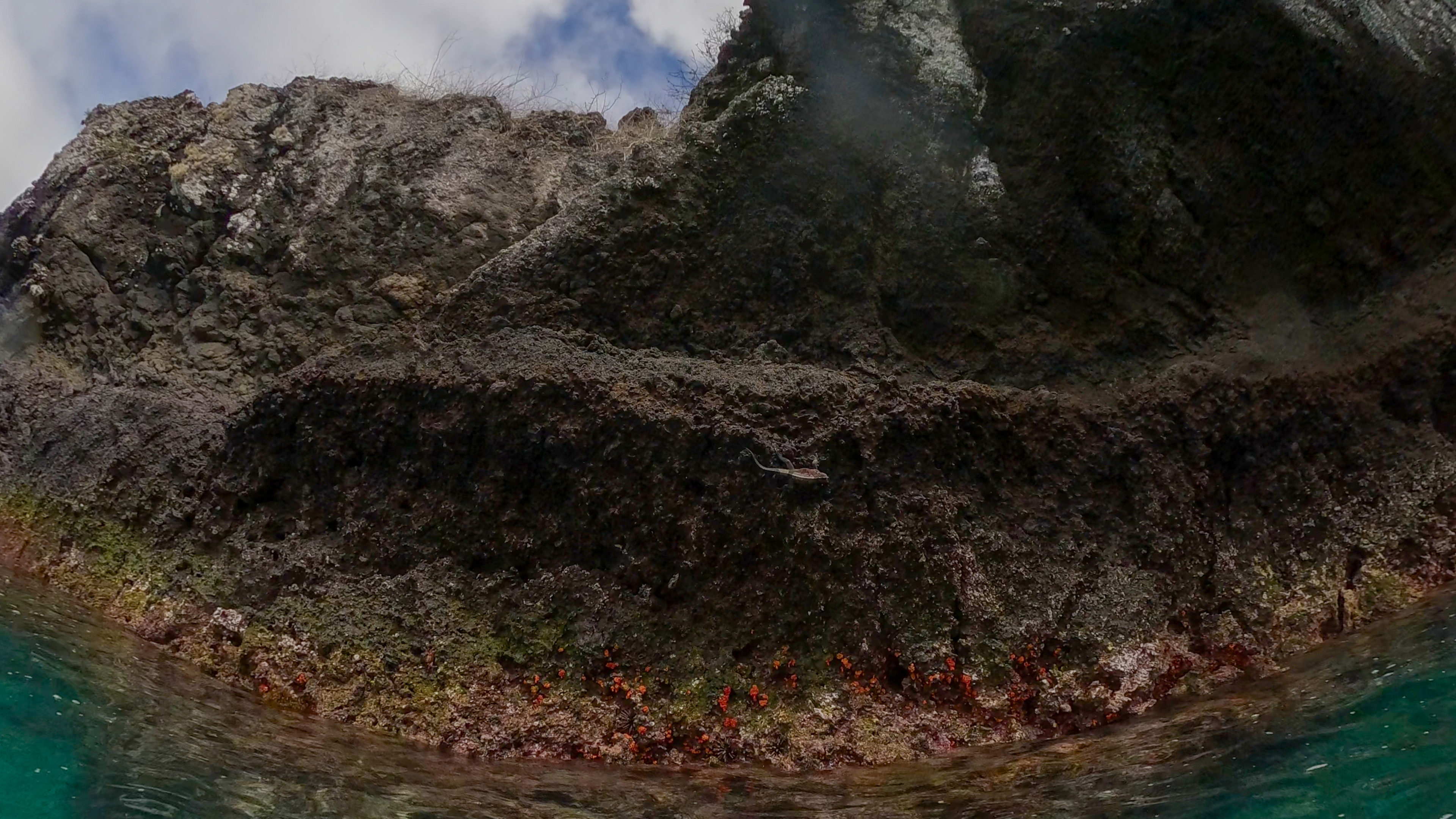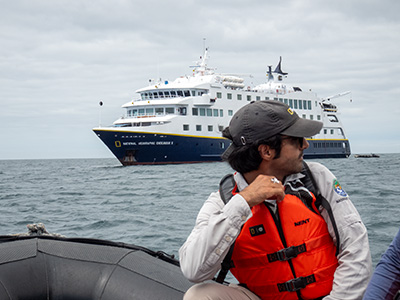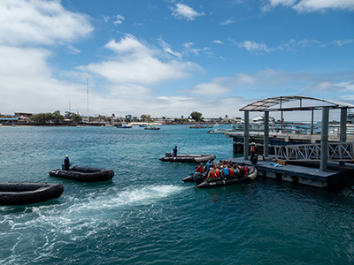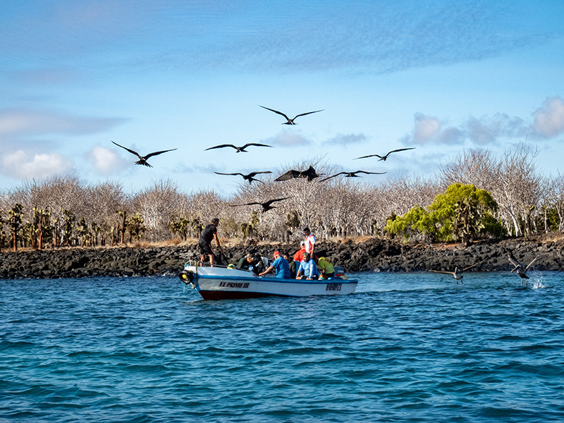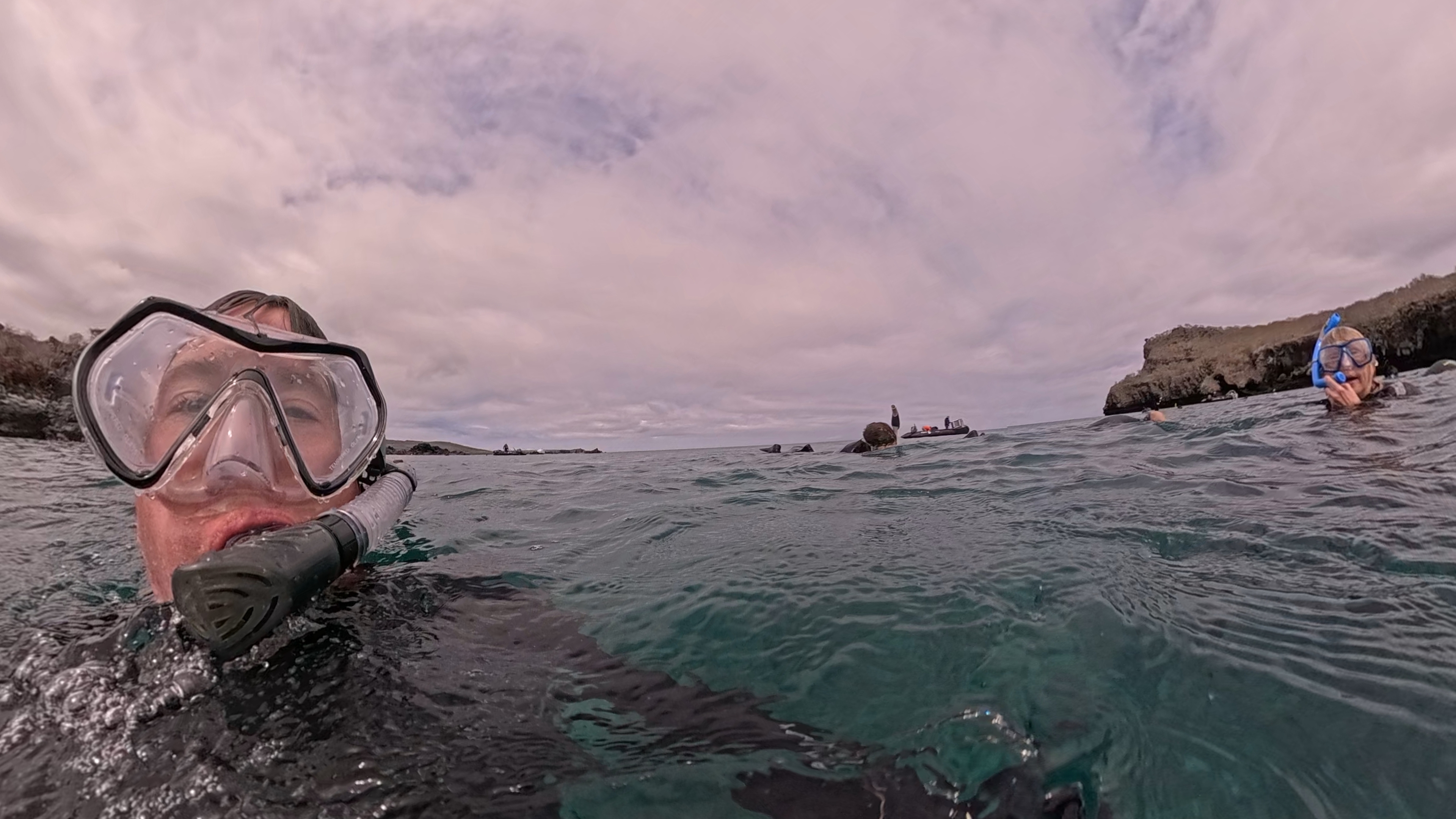 Daphne Major snorkling and Zodiak.